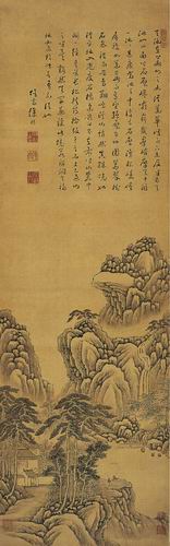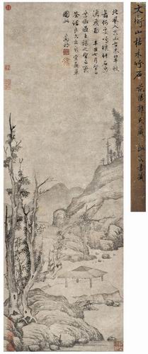 徐枋,號俟齋,崇禎十五年舉人。其父曾在明朝為官,但隨著明王朝大厦傾覆,在“忠臣不侍二主”的道德觀支配下,於順治二年,成了明朝的殉節之臣。雖是舉人的徐枋,心懷國破家亡之仇但又對現實無可奈何的心情,走上了一條當時很多遺民畫家都選擇的道路,或遁跡空門,或歸隱山林,如閑雲、野鶴,終日以山林為伴,以賣畫自給,永不入城市。其門人潘耒曾言:“徐俟齋先生文章書畫妙天下,時人以重幣購之,不肯落一筆。” 徐珂《清稗類鈔》亦言其畫“宗巨然,間法倪、黃。自署秦餘山人。得其遺墨者,視如拱璧”。可見其畫在當時就極為罕見。水墨绢本立轴《松山觀瀑圖》為徐枋一次游山訪池的臥遊圖。全幅用筆整飭工致,不帶一絲火氣,墨色明淨秀雅,溫文到了極點。圖中上半段留白處,以瘦硬神傲、屈折蕭疏的行書寫下遊記一篇,與下方圖景兩兩相照。前半篇描述天池之美,此乃畫面的上半段的遠景峰巒;後半篇記錄了遊山的過程,即畫面的中、近景:從平地,到谷口,經青道長松,路過椽椽茅屋,終至半山開闊處瞭望平臺,端坐其上、遙望絕壁,這樣悠閒、恬靜,亦人亦仙的生活,其中自有作者的消遣、寄託,也赫然是他自己隱居生活的寫照。