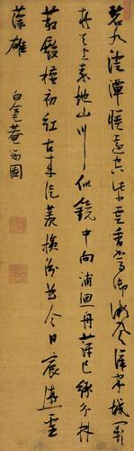 作為“晚明四家”之一的米萬鍾,生平除了書畫,尚有兩個愛好:第一是玩石,第二是修園。這些愛好使慘遭魏忠賢陷害而削籍奪職的米萬鍾,心靈上獲得了很大的慰籍。米萬鍾於京城所築三所名園,分別為“漫園”、“勺園”、“湛園”。然而在其多幅詩軸中均以“尊拙園之一”、或“尊拙園”為題,或是對上述自家園林的謙稱?在此幅綾本立軸《草書七言詩·尊拙園》中,米萬鍾以連綿不斷的點線將他的兩個愛好——字裡行間的不羈天趣與園林家苑的詩情畫意——對接起來。其列行、布白不求勻稱,點化各盡其能,做到了“和而不同,違而不犯”。行筆左右搖擺,線條牽縈連屬;結體寬博豐勁,大開大合。整體上給人以悠然飄逸、閒散平實之感。其線條輕盈又不失穩重,實非人人所能模寫而出。此作曾經清劉位坦、劉銓福父子兩代遞藏,後又為已故現代學者胡小石舊藏,試想如在今人別墅之堂中懸而觀之,又該是如何一番風雅。
