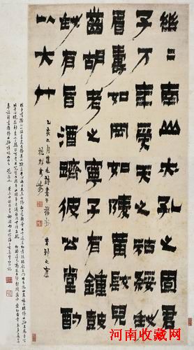 杭州金農比鄭簠晚生六十年,鄭簠所獨立宣導和影響的清初隸書書壇已經蘇醒,當然,金農也不會不受其影響,作為“揚州八怪”一傑的金農,畫怪、書怪,性格更怪,由他孤傲不群的怪性格,更不會步人後塵而安於平淡,他也像鄭簠那樣,在隸書的領域中開始超越,超越時風,超越鄭簠,直追前賢,逐漸創造出自己特別的隸書風格。以其自己的話來說,即:“恥向書家作奴婢”,終於成為清代中葉碑學三鼎足之一。