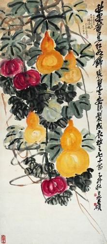 相傳吳昌碩早年曾拜訪任伯年,問藝求教,吳一出手便受到任伯年首肯。任伯年建議吳昌碩以書入畫,“子工書,不妨以籀寫花,草書做幹”,並預言了其日後的藝術成就。浸淫於明清以來盛行的金石考據風氣,吳昌碩精通金石碑版,具有高超書法篆刻成就。一般而言,繪畫中的“金石”可能最直接地表現在線條的應用上,篆隸筆法的蘭花、草書筆法的藤條,使書法功力轉移入繪畫成為切實可感的蒼勁縱放氣魄。“金石”首先從畫面“構成元素”如用筆運線、拓片入畫等,更縱深地發展形成為一種審美趣味、一種品格趨向;漸漸地樸陋古拙並具擴張之勢的“金石氣”蔓延開來,渾厚、雄強之美在那個動蕩不安的時代成為潮流。以此為背景,在《葫蘆圖》中,一團淋灕墨色傾瀉而出,金黃的葫蘆間纏繞著熟紅了的南瓜,筆墨縱橫恣意不拘小節,一派雄渾曠放之氣在畫面中流淌。