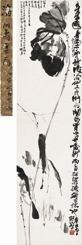 潘天壽學養修為很高,眾所周知,他曾任西湖國立藝專校長,其後任浙江美術學院院長,並著有《中國繪畫史》、《聽天閣畫談隨筆》等。在繪畫傳統的學養上,潘天壽遠師宋元,近取其同時代大師:或許他從馬遠、夏圭筆下習得雄健幹練;從八大畫中悟得了奇絕氣格;從揚州畫派中尋得恣意性情的塑造;從嶺南一派中納得明麗酣暢;當然還有他得以機會切磋問藝、亦師亦友的吳昌碩,吳樸茂畫風、籀篆風骨定為潘天壽深入研習。潘天壽博採古今,最為難能可貴之處在於,他從未泥古於任何一位前人大師;“邊納邊吐”是為一種有理想的藝術家的修養自覺,更是潘天壽天賦直覺、強悍個性的必由出路。潘以此履險入絕終成自家面貌。吳昌碩數次盛贊潘天壽:“年僅弱冠才斗量”、“天驚地怪見筆落”,“久久氣與木石鬥,無掛礙處生阿壽”,對眾多研習自己畫風的後學,吳唯獨評價“阿壽學我最像,跳開去又離開我最遠,大器也。”而此次拍品中潘天壽早期作品《墨荷圖》正是潘結識吳昌碩的這一年,我們有幸通過這幅畫作來品鑒藝術家的修養與天生才情;另一方面,時隔十三年的題識補款也成為青年潘天壽心理活動和社會活動的雙重記錄,意味深遠。