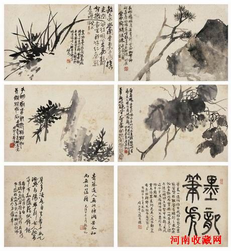 繼任伯年之後,將海派繪畫推向鼎盛時期的正是西泠印社的首任社長吳昌碩。他曾自謙“三十學詩,五十學畫”。一冊作於1893年的《花果冊》道出其五十歲、初具自家面目時的師承、畫風與交遊情況。四幅大寫意松石、幽蘭、葡萄、老柏,淋漓奇古、蒼朴天趣,淵源于徐渭、八大、石濤、陳淳等各家之長,其頗具書寫味的金石篆籀氣與斜向取勢的對角構圖等自家作風亦已初步形成;一題再題的律詩,氣勢奔放、韻律奇拗,有類其畫,亦自道性情;書法也與畫風筆調開始統一,渾然成為一個整體。這一時期吳昌碩的繪畫藝術正處於不斷學習、廣泛涉獵、轉益多師的孕育時期,勇於吸收的階段。他不僅師法于古人,也在與同時代交遊的師友中獲益非淺。從題跋來看,吳昌碩在完成此冊頁後,定曾多方請教切磋于其師友們,張度、王懿榮、蒲華這三位題跋者無不是金石、書畫圈中赫赫有名之大家,而他們對吳的評價——“墨龍筆虎”、“腴潤”、“蘊藉”、“蘊藉伏鋒鋩”——皆聚焦於其筆墨中深厚的金石特色。