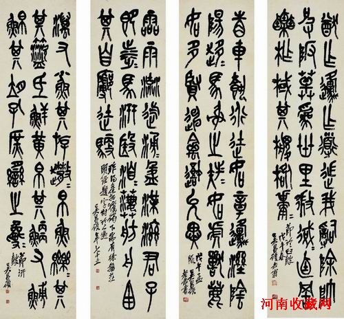 吳昌碩一生尤其前半生用力最勤的就是書法和篆刻。他的書法,由唐楷而漢隸,再攻篆籀金石,寫石鼓文,數十年不斷。寫於1918年的《節臨石鼓文》四條屏為其75歲所書,正當書風成熟期。其門人沙孟海曾評價吳昌碩的大篆“七八十歲更恣肆爛漫、獨步—時。”觀此文,結體左右緊束,上下縱展;字裡行間氣充力足,縱逸放達,頗顯沉雄端莊;用筆則以粗細不同的筆觸來表現豐富的線條,起收及轉折處方、折、圓並施,化方折為圓轉,寓方于圓,多面出鋒。這種種變化,無不體現出吳昌碩對其用筆的熟諳;從中更可以看出其內在的特點:徹底改變了《石鼓文》原文略顯方正和圓勻平整的形態,充分顯示出極旺盛的藝術生命力。
