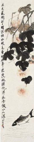 齊白石受到陳師曾的影響,師法吳昌碩繪畫藝術。他曾有詩云:“青藤雪个遠凡胎,老缶衰年別有才。我欲九原為走狗,三家門下轉輪來”。其書法受吳昌碩的影響,多取法秦漢碑刻;篆刻在取法吳昌碩的基礎上,更加突顯其以刀代筆的“書寫性”;而繪畫亦從吳昌碩碑學之路入手,把篆刻的金石之趣融入到畫中,但他的作品自創“紅花墨葉”一派,充滿自然天趣,以簡以情取勝。《芙蓉游魚圖》以極為精簡的筆墨,誇張的手法表現而成:幾片闊大的墨葉,自上垂下,或濃或淡,三兩筆掃出;數朵芙蓉,以調得極淡的洋紅蘸水點染而出;一尾遊魚,區區數筆,即已憨態可掬。一株芙蓉似乎馬上就要落入水中,而魚仿佛已有所感應,則急著要遊走。雖然畫面極簡,卻簡而不空,正是畫外的情趣令人回味無窮。如此的雅俗共賞,融高雅與俚俗、精英與平民趣味為一爐,極大地拓展了藝術的天地,被公認為“人民藝術家”,齊白石當之無愧。