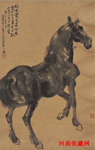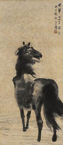與此同時,伴隨着孫中山領導的革命,在廣東出現了以高劍父、高奇峰和陳樹人為首,以西畫革新傳統繪畫為己任的“嶺南畫派”。雖然時人猛烈抨擊嶺南三傑受日本畫影響的“新國畫”只有渲染而沒有筆墨,然而徐悲鴻等則在評論中對嶺南派的革新充分加以肯定,並提出引入西方寫實主義以改革中國畫的新主張。這也是在世紀初和“五四”時期思想家影響下,許多留洋歐洲的年輕人的選擇。他們回國後,大都從事美術教育、開設素描、透視學、水彩畫等課程,以提倡寫實主義為鵠的。在創作上,徐悲鴻青年時期以素描最為出色,所作人體,善於將線描與明暗結合起來。後以準確的造型、傳統筆墨工具畫人物、動物、花鳥和風景,探討融會中西的“寫實彩墨”,在四十年代以後的中國畫壇產生了深刻影響。除卻其歷史畫題材的創作,他最享有盛譽的便是駿馬圖了。此次上拍的《馬嘶圖》和《立馬圖》分屬不同上款人。準確的骨骼結構,逼真的外形動態,一氣呵成、水分充足的潑墨方法,形成獨具個性的徐式畫馬模式,從而對傳統畫馬有所超越和發展。