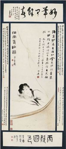 《海棠春睡圖》雖無年款,但從其風格來看,當屬張大千早年近似吳小仙的筆法線條特色,圖中之小家碧玉,面形俊俏雅致,秋波流轉,尤其臨窗嬌慵之態,盡顯其仕女畫中一貫的唯美與浪漫特質。1981年,蔣兆和、劉淩滄、黃均、潘絜茲、王紹尊等眾書畫家及鑒賞家有幸拜觀此畫,回憶與大師交往之餘,更留下一片讚歎之辭,被藏家裱於一體。
