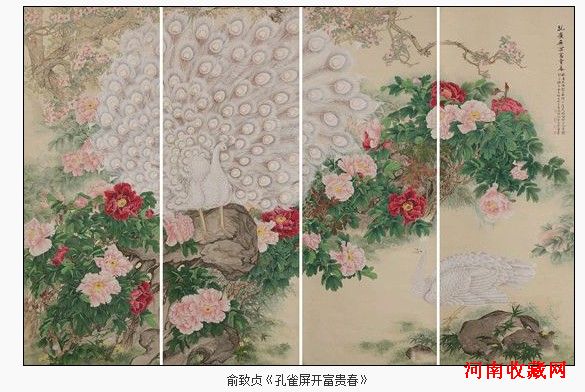 《孔雀屏开富贵春》堪称俞致贞工笔花鸟的精品作。作为一位杰出的女艺术家,她对美的追求和欣赏有着女性特有的敏感、细腻。多年来俞致贞一直喜爱牡丹,同时创作了许多十分具有收藏价值的作品,受到了广大藏者的喜爱。此套通屏,尺幅巨大,画面上方有一树怒放的海棠,下方绘有大丛盛开的牡丹,落英缤纷,斗色争妍,充满了浓浓的春意。一雄一雌两只洁白无瑕的白孔雀掩映在花丛之中,白孔雀傲然立于怪石之上,似乎在跟姹紫嫣红的牡丹争艳,极显天真古趣;雌孔雀信步闲游,并被开屏的孔雀所吸引,张嘴嘀歌仿佛在歌颂这争奇斗艳的美好景致。两只孔雀神情兼备,具有拟人化的效果,尤其是眼神格外传神,彼此相交融合,惟妙惟肖。牡丹乃百花之王,俞致贞笔下的牡丹花更显明艳多娇,争相开放一展其国色天香之本色,竟引得百鸟之王白孔雀都不禁驻足流连,开屏与其相媲美。“两王”争奇斗艳,倾国倾城,令人侧目,而满树的海棠也毫不逊色,竞相怒放。掩映在花丛中的怪石,用陈老莲的章法绘成,以骨法勾勒湖石,变形中略有夸张,富有装饰趣味。