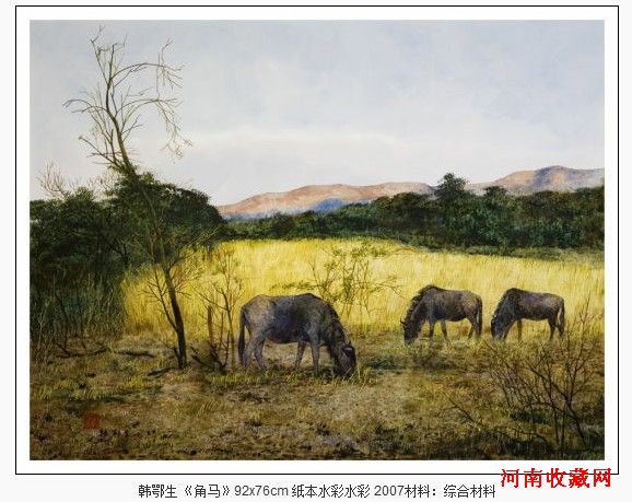 《角马》以写实的描绘,生动丰富的色彩张力,把水彩的特色运用到极致。宁静之下,处处危机四起,面对鲜有的安全和屡见的危险,角马为了更好地生存和繁衍生息而不断去面对选择,这就是角马的生存法则。这也许就是为什么角马面对凶险的生存环境能繁衍至今的原因之一。