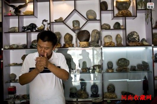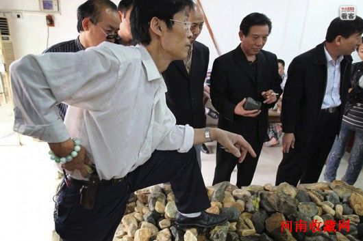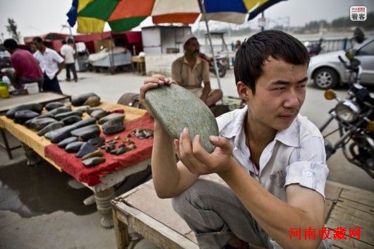 随着近年来和田玉的行情一路飙升,业内和田玉的“赌石”活动也愈发活跃。和田玉交易链中,第一环节至今还采用‘赌石’的方式进行。一块外表看似普通的石头,一刀切下去有可能让拥有者瞬间暴富,也有可能让拥有者倾家荡产。图为2011年5月,郑州市西郊新开了一家赌石店。