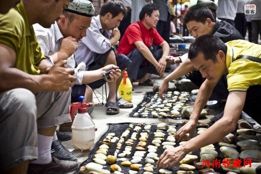 新疆和田,热闹的玉石巴扎(即“市场”)是外地游客来和田的必到之地。每周五、周日,在和田市大清真寺前的街上,来自周边各地的农民会带着自己的玉石,就地摆起小摊叫卖。