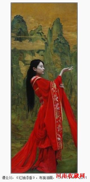无论是青绿山水或是红衣女子,亦或是别的作品中身穿旗袍的少女以及寂静的插在花瓶中的莲蓬,作者只愿去展现架上绘画中最本质的唯美精神。