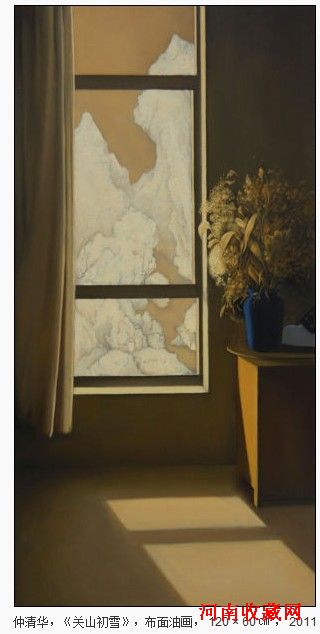 仲清华的作品《关山春雪》从温情的日常场景出发延展至古代文人热衷表达的高远冬雪。开放的窗户将观者带进一个超自然的空间,这两种空间的并置既打破了二维和三维间的界限,又以激烈的视觉冲突彰显了艺术家内心安静同理想化境界之间的“缺席”状态。画面语言自然糅合,色彩静穆素雅。他对色彩否定的肯定之后,刻意减弱色彩明度和纯度的对比,通过空间构成来营造一种神秘气氛。画家试图表现从自然物象至视觉元素再到“内心视象”之间的疏离感,追寻一种古代文人画具有的“非戏剧性的宁静境”以及融入一层诗意般的抒情气氛。