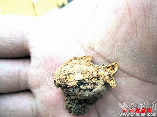 昨日,记者在现场看到了这条金鱼饰品,虽然鱼身上还沾着泥土,却无法掩盖其金灿灿的光芒。鱼形小巧,但鱼眼、鱼鳍都具备,鱼鳞层次分明,鱼腹扁平,鱼腹中部还有精美的心形金片。整条鱼看起来活灵活现。