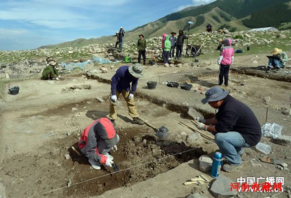 今年7月,西北大学考古队首次对距今2000到3000年之间的新疆巴里坤县红山口古代游牧民族大型聚落遗址进行发掘考古,工作区域选择在一号地点一个面积大约200平米的石围居址,发掘出大量陶片和人的骨骼。 红山口古代游牧民族大型聚落遗址位于巴里坤县东南30多公里,北距兵团农十三师红山农场5公里。处在东天山北麓。聚落遗址共有三个地点,都是冰川基隆的高台,一号高台上依居山势有七到八层人工垒砌的鹅卵石房址,在房址发掘中不仅发现了大量的陶片,还有人的骨骼。