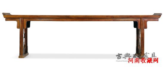 此黄花梨翘头案极为少见,案面长达三米二,是所知最大型的,未经裁切的独板案面的条案之一。长案的案面常遭切割,因此能以原状原尺寸幸存者屈指可数。除了微小的修补外,此案实属原装原配,它亦是早期家俱制作中,奢华地使用珍贵的黄花梨大料的范例。大案造型宏伟典雅,两端翘头向上扬,带起沉重的案面,使之雄伟而不失灵动。案腿间装如意云纹挡板,也是大料整挖,这种装饰风格的条案在明代版画中常可见到。此黄花梨独板大翘头案系原来头家具,包括托泥亦为原配,十分难得。