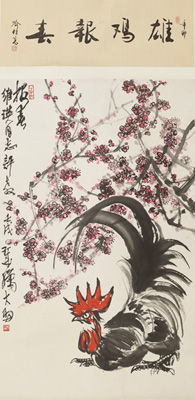此幅《报春》是陈大羽雄鸡图的代表作品,画面上红梅竞放,雄鸡俯身雄视前方,尾羽高高翘起。观大羽先生之画,先生以中锋篆意入笔,侧锋辅之,用笔轻徐疾涩,墨色染泼相兼,极富浓、淡、干、湿等墨色变化,设色稳重中又有绚烂。怒放的红梅中,一红冠公鸡引吭高歌,老辣夸张,威风凛凛,整幅画面洋溢着浓烈的春意。综观其画作气势浑厚奔放,笔墨酣畅有致,色彩鲜丽明快,意境清新隽永。他笔下的雄鸡骨气洞达,精气饱满,神采飞扬,催人振奋,深受广大民众的喜爱。白石老人赞誉他画鸡"应得大名"。因此民间素来有"白石虾虫悲鸿马,可染水牛共胄驴、苦禅老鹰大羽鸡"之说。