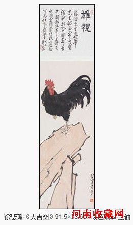 与中国花鸟画寄兴托志的传统一脉相承,徐悲鸿的动物画也有着丰富的精神寄寓。所画鸡,多是昂首挺立、怒发冲冠的公鸡,几乎没有母鸡或小鸡雏,没有慈爱、温暖和柔情的一面,而更多地像斗士和高歌的勇士。正因为如此徐悲鸿的作品一旦在市场露面,都成为场上争夺得焦点。