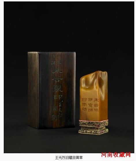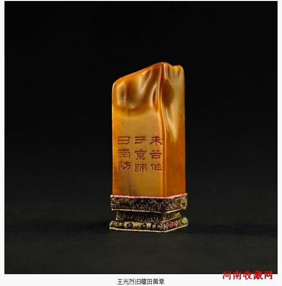 据悉,一方珍贵的清早期田黄随形方章即将亮相北京匡时(微博)2012年秋拍。这方印章曾由近代东北书法篆刻第一大家王光烈收藏,色泽呈淡“橘皮黄”色,肌理蕴极细致之萝卜纹,绵密欲化,红筋显着易辩;其石质醇厚、温润,皮壳呈乌鸦皮色,有一种难以形容的油润感,显为中坂所产上佳田石,色质俱佳。此印整体呈方形,造型规整,气息文雅,高6.7厘米,重达124克。