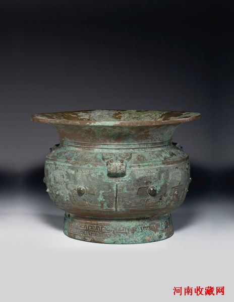 此器品相佳妙,出自日本井上馨侯爵 (1836-1915) 旧藏。井上馨是日本历史上的风云人物,他收藏的明治时期艺术品以数量之丰而闻名于世,他对茶道用具和中国古青铜器亦情有独钟,此次拍卖的三羊首尊便是一例。此尊的特色是其器形格外宽硕,外观端凝典雅,甚具王者之风。值得一提的是,此尊内底錾一对首尾相逐的蟠龙,内刻一神龟,其中央再饰一蟠龙,纹饰布局极为罕见。