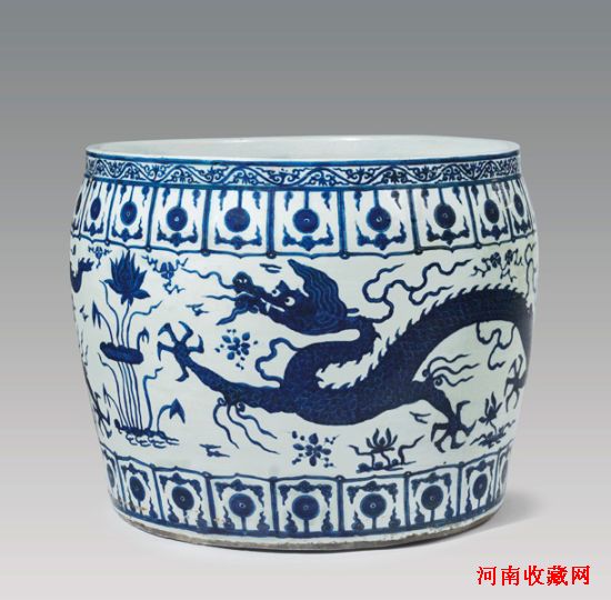 此器的纹饰用青翠的钴蓝绘成,造型妙趣横生。五爪龙纹乃天子象征,而莲池龙纹的组合更是罕见。在传统纹饰中,龙纹多以云龙纹、海水龙纹的形式出现,间或衬以缠枝花卉。另一特点是,这件品相佳妙的十六世纪青花缸,因其口径达27吋,故极难烧制,一般需时九天方大功告成。由于成品率极低,官窑瓷工往往视之为畏途。由于器型如此敦硕的大缸须在特定的瓷窑烧制,其烧造成本不菲,所以应是宫中重器无疑。