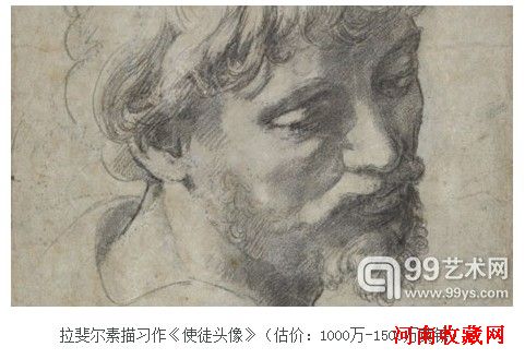 拉斐尔用黑粉笔绘制而成的《使徒头像》(估价:1000万-1500万英镑),是该艺术家创作生涯当中的一幅非常重要的素描作品,它是拉斐尔最为重要的最后作品《耶稣变容图》里一个重要形象的暂时的“辅助底图”。《耶稣变容图》,它是于大约1516年受了红衣主教朱利奥·德美第奇之托而创作的,最近还被一些学者评价为“文艺复兴时期油画中最重要的其中一幅画作”。当拉斐尔于37岁意外辞世时,他的遗体被陈列在自己的画室里,而他未完成的作品《耶稣变容图》就悬挂在他的头顶上方。据悉,这幅油画作品现在存放在罗马的梵蒂冈博物馆。