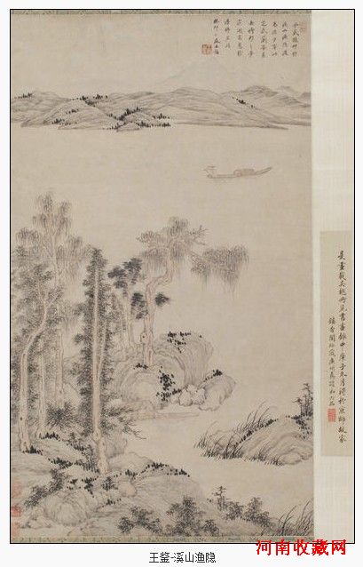 从他的题款可知,赵雍《溪山渔隐图》(今藏北京故宫(微博)博物院)曾为王鉴收藏,由于他的老友孙少宰(孙少宰,生平事迹不详,但在王鉴传世画跋中,多次提到此人,当为其时极喜书画的收藏家)甚爱之,乃以“定武本兰亭序”相交换。然时隔多年,王鉴对赵雍《溪山渔隐图》念念不忘,于是模写了这画以志前缘。和赵雍原画相比,王鉴借用了赵画的坡石组合,但是变换了位置。画面采用明代宣德纸,坚实紧密的纤维匹配了赵孟俯所倡导的书法用笔入画,特别是近景的山石和远景的坡岸,笔笔写来,显示了与赵孟頫《秀石疏林图》的一家眷属;而细笔勾勒的人物,线条劲挺,刻画入微,为其它三王笔下所鲜见。