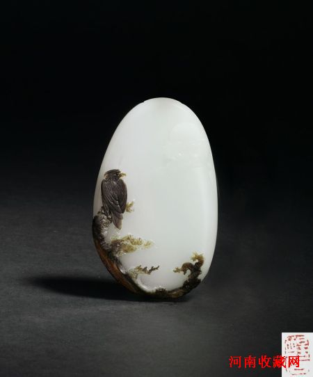 说明:此件为高品质白玉籽料琢制,玉白质润,脂白细腻。将黑色的皮作一鹰隼雄踞苍松之上,炯目视之,喙爪尖利,一股凶猛之气的外露。“何当击凡鸟,毛血洒平芜”,尚未凌空出击,便以气势撼人。没有高瞻远瞩,便不可能有直上云霄的成功一击。作品画面中线条苍劲朴拙,如行云流水般勾画出鹰隼和苍松的轮廓;大刀阔斧式的俏色渲染,显出其刀法的凝练,背面的大面留白更加凸显设计的简约;苍松鹰隼,意趣盎然;线条纵逸挥洒中,是一种雄健磅礴之气。