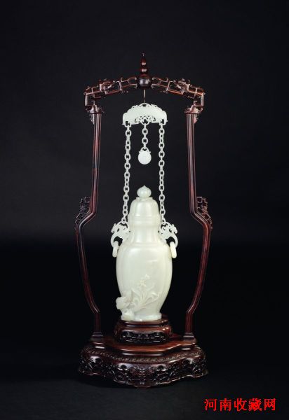 说明:和田玉籽料白玉,玉瓶稳重,端庄,形美,玉润。玉质坚硬致密,色泽均匀,质感莹润。作品朴实大方,没有繁杂的纹饰,纯以玉质和雕工取胜。雕工精致规整,线条简练流畅,充分显示玉质之美。