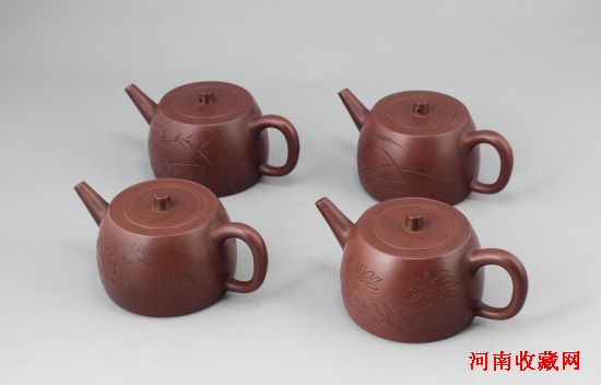 说明:四把壶身分别为唐云绘梅兰竹菊四君子图,沈觉初刻,范早大制作。壶底印为“范早大”。