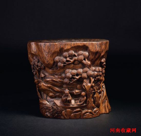 说明:沉香木大材独木圆雕而成。自然随形。外壁高浮雕通景山水人物。景致清雅。