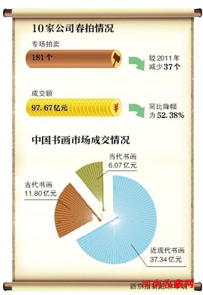 2012年春拍,10家公司共举办181个专场拍卖,平均成交率70.05%,成交额97.67亿元。与2011年春拍相比,专场数量减少37个,成交额同比降幅为52.38%。