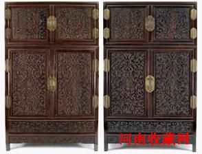 家具方面,亮点是一对出自德国外交官旧藏,在1945年或之前购于中国的紫檀西番莲顶箱立柜