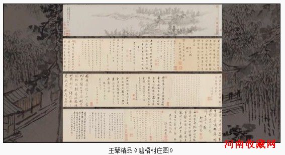 王翚《碧梧村庄图》手卷在《古缘萃录》中列为首件作品。“碧梧村庄”的主人叫顾荇文,字在湄,号维亭,昆山人。他是元代名士顾瑛的后裔,也是王翚的弟子,此卷即王翚为其弟子顾荇文所作。