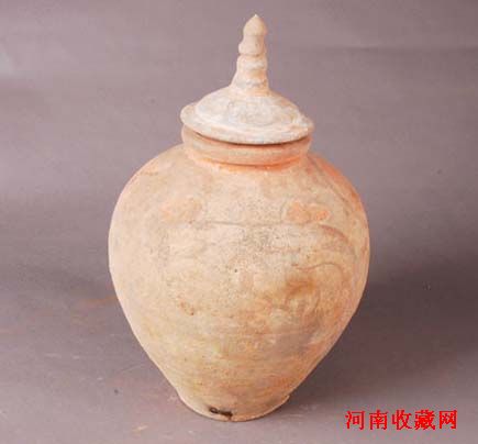 1. 塔式罐 1件,为泥质灰陶。由盖、罐组成。盖呈塔形,为竹节状塔身。罐敛口,方唇,溜肩,短颈,深鼓腹,平底。通体施白衣,其上用红、墨彩绘画图案,图案似团花纹,彩绘保存较差,部分脱落。通高36厘米,口径11厘米,腹径37厘米,底径10.5厘米(图一)。