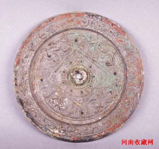 铜镜的发明源始于何人,已无从查考。但它与水有关,却是千真万确的。可以这么想象,在很久很久以前,有一个女子经常到河边梳头、洗衣,与水结下不解之缘。有一次,她偶然瞥见自己在水中的倒影,忍不住搔首弄姿,水发现了她的美,她把美留在了水里,想了,就去找找。这件事被一个男子看在眼里,于是就赶制了一个陶盆送给她,让她把水端回家,这样美就可以常伴在身边了。那个陶盆也就成了他们之间的定情信物。后来又有了用铜铸造的盆,名“鉴”。在外表修饰华丽的铜鉴内照影,很能体现使用者的尊贵身份。再后来就出现了铜镜。较之铜鉴,铜镜有便于携带、可随时随地取用等诸多优点,所以很快得以推广普及。也许与鉴产生的年代比较接近或习惯称谓使然,那时的人们也把铜镜称为“鉴”,郑玄注:“鉴亦镜也。”其照影的一面打磨光亮,背面大都铸有钮和纹饰,可穿绳悬挂,亦可穿金属条固架支立。