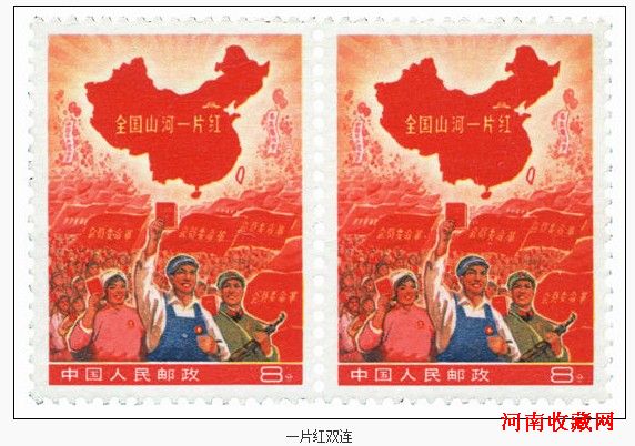 在1968年9月“文化大革命”期间,全国除台湾省外29个省、直辖市、自治区均成立了革命委员会。为纪念和庆祝这一事件,邮电部决定于1968年11月25日发行1枚“全国山河一片红”邮票。面值8分。邮票图案为工农兵手持《毛主席语录》,背景中“革命委员会”的红旗汇成的红色海洋和工农兵群众热烈欢呼的场面,上方为一幅中华人民共和国地图,地图上除台湾省外全部绘成大红色,上面印有“全国山河一片红”金字,邮票票幅为30毫米×40毫米,齿孔11.5度×11度,整张枚数50(10×5)。影写版。北京邮票厂印制。集邮者称为“一片红”。