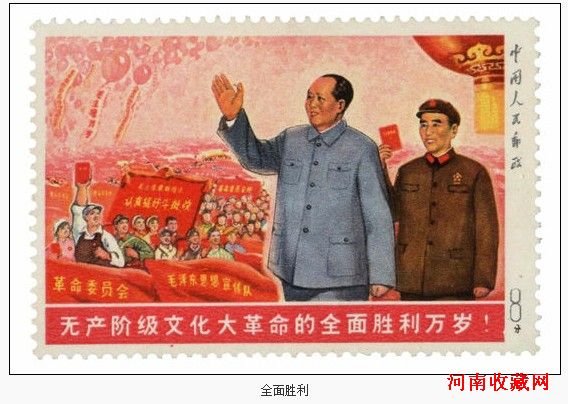 1968年10月1日,为纪念中华人民共和国成立19周年,发行了一枚邮票,名称“无产阶级文化大革命全面胜利万岁”。集邮界俗称“全面胜利”邮票。面值8分,编号为“文5”,
