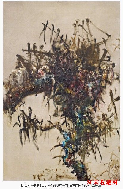 当代艺术版块中,周春芽早期作品专题基本涵盖了他1970年代至1990年代的所有创作类型,其中以1993年的巨作《树的系列》最为珍稀难得。周春芽最广为人知的意象是“石头”系列,但在同期他还创作了数量极少的“树”,该系列引入了古典文人画的文化符号,诚属周春芽第一个创作高峰的佼佼者。本幅尺寸巨大,予人以强大的视觉冲击,但细节又极端丰富,结构繁复错杂,色彩鬼魅鲜艳,油彩厚处如浅浮雕,肌理重迭多变,薄处又如书法用笔,笔锋飞白狂放,犹如大写意的国画,将文人画中孤寂隐逸的树,一变为怪诞、狰狞的强力表现。
