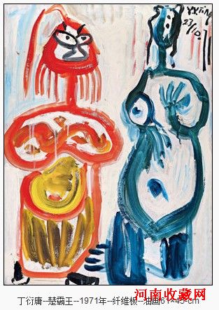 丁衍庸1971年创作的《楚霸王》,描绘的是传统京剧“霸王别姬”中的一段,在丁氏存世百余幅的油画中,戏曲题材仅有七幅,相当稀有。《楚霸王》用色鲜艳大胆,人物造型简括夸张,虽是油画,运笔却如沾水墨于纸面上勾画一样,举重若轻,转侧自如,寥寥数笔将结构、神情毕现,且不乏稚拙幽默神采,尽显丁氏油画线条的表现力及书法用笔的魅力,无愧“线条的大师”之称誉。