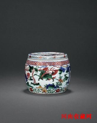 明万曆 五彩瑞兽纹鼓式盖罐 H 12 cm