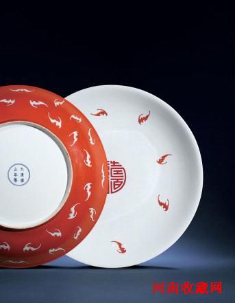 清雍正 珊瑚红地粉彩百蝠捧寿纹大盘(一对) D 51 cm