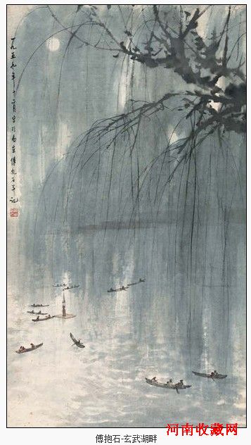 近现代书画部分,将有傅抱石南京题材作品《玄武湖畔》亮相。此幅作品为傅抱石1959年所作。南京的名迹一直是傅抱石热衷表现的主题,在生活于南京的20年余年中,傅抱石曾有多幅以玄武湖入画的作品。傅抱石曾以《初春》、《春风杨柳万千条》、《玄武湖一角》、《月下玄武湖》等为题来表现玄武湖的美。玄武湖小景在其多次写生实践中总结升华,注入了新的时代内容。此幅《春夜玄武湖》写玄武湖月下的静谧,水天一色、树影婆娑。画面主体部分被巨大的柳树所覆盖,柳树的躯干以浓墨写出,薄施淡绿染出大片绿荫,如同春之帷幕,透过绿色帷幕依稀可以看到湖面、水岸、游船。湖面上游船散落,月夜游春气氛浓厚。整个画面清新湿润,恰如其分地传达出春意阑珊的静谧意境。桨声月影里的玄武湖,在傅抱石笔下如诗如梦。此外,傅抱石《听泉图》、《天池飞瀑》、《红雨泛舟》将一同亮相。