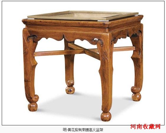 家具部分,焦点无疑为“明 黄花梨有束腰高火盆架”。曾为王世襄先生、柯惕思先生多次撰文研究之物。此火盆架造型俨然是一具十字枨大方凳。牙子与束腰一木连做,挖出壸门轮廓,沿边起皮条线,与腿足相交处透锼卷云一朵。皮条线顺腿而下,形成内翻卷珠足,足底承以圆球。四足外角还从球上抽出一茎花叶,三歧,顶尖上贯到束腰部位。火盆架留存数量非常少,此火盆架保存完好,蕴含了浓郁的历史人文价值,十分难得。