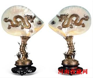 一对 “珍珠贝镶银龙竹节柱宝饰供件”是中国宫廷陈设供件,它取扇形大珠贝内面镶铆神龙,贝下由四簇萱草环抱壮竹节柱擎架而立,银白相耀,造型别致,神龙雄健不可一世,应为十九世纪中国内廷工匠所制作。令人惊奇的是,底座壁上竟刻写着 “英国肯特号重巡洋舰特遣舰队(中国站)赠于皇家海军陆战队轻 步 兵 士 官 ALBERT JOHNBANKS.1909年11月”。中国的龙纹珍宝本是宫廷重器,却落藏在入侵中国沿海的巡洋舰上,并作为荣誉奖赏给一名士官,怎能不使人联想其当年英法联军侵入北京焚劫圆明园之事,以及清政府屈膝求和,赔银献宝的种种耻辱。作为遭外国侵略的历史见证,此物有巨大的警示作用。