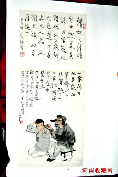 本次展览最大亮点当属已故著名画家李可染的一幅特殊画作——《白毛女》。它表现的是歌剧《白毛女》中杨白劳除夕夜为喜儿扎红头绳的生动场景,画中人物栩栩如生,非常传神。作者在画上方用毛笔题写了戏中那段脍炙人口的经典唱词“人家闺女有花戴”,落款标明此画创作于“三十八年四月某夜,观白毛女歌剧归来”所画。卷轴上方,为原中国画研究院院长刘勃舒的鉴赏墨宝——“传世之杰作,它必然是具备又传统也现代,又艺术也思想,又画品也人品,又雅也俗的矛盾统一”。据“读画楼”创办人梅子先生透露,此幅作品正是友人刘勃舒先生转让。