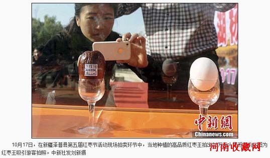 记者在拍卖现场看到,金银铜奖“红枣王”均以10颗作为标的物拍卖,每颗红枣都大过鸡蛋,最大者重达90克,15颗枣就够1公斤。结果铜奖红枣王被拍出1.8万元,银奖红枣王拍得5万元,金奖红枣王最终以26万元高价被泽普县金湖杨农副产品公司竞得。