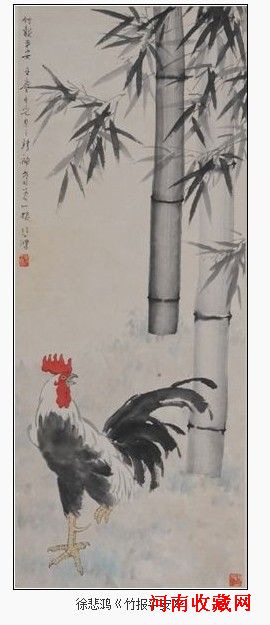 徐悲鸿笔下的鸡,同他画的马、牛、猫一样,都主张以写生为艺术创作的基础,要求惟妙惟肖。“鸡”谐音喻“吉”,寓意“吉祥如意”,“竹”谐音喻“祝”,象征“长青平安”,《竹报平安》表达了“祝福平安大吉”的美好愿望,此类题材作品是赠送友人的最佳之物了。