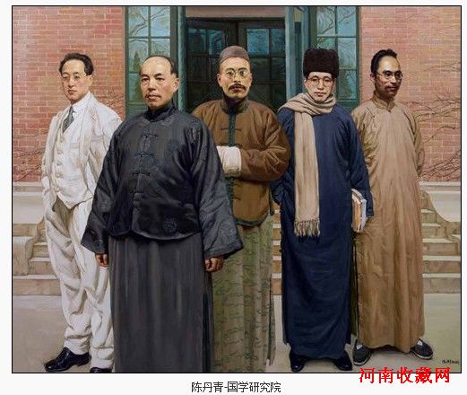 其中,油画部分,将有陈丹青人文力作《国学研究院》华丽登场。据悉,该作创作于2001年,是陈丹青为庆祝清华大学90周年校庆所作。同时,这也是他任职于清华大学五年中唯一的大幅作品(187×223cm)。作品描绘了五位在中国近代学术史上具有重要影响的学术大师,画家将五人在画面上一字排开,这也是陈丹青的典型构图之一。从左向右依次为:赵元任、梁启超、王国维、陈寅恪、吴宓。陈丹青敏锐地抓住了众人的不同特点,人物精神气质跃然纸上而入木三分。画面整体的棕黄色调酝酿了怀旧的浓郁气氛,一种稳定而深沉的力量扑面而来。此画曾因作为《新周刊》(2010年9月第330期)的专题“民国范儿”封面而被众人熟识,并在随后社会上引起的关于“民国范儿”的热烈讨论中,成为当之无愧的“民国形象代言”。“民国范儿”也一直是此画作者陈丹青主推的话语之一,并多次在自己的文集和演讲中提及:“民国范儿并不单指权贵,而是各色人等坦然率真那股劲。民国前后出来举事的家伙,敢作敢为,有豪情,有胆气。成败不论,忠奸另说。”