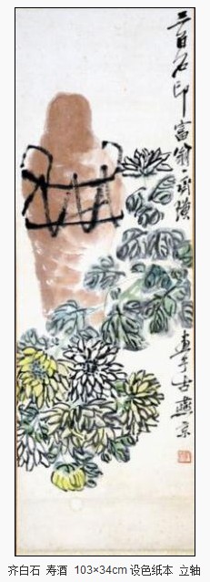 齐白石一生养生有道,平日不饮酒,只有食寒性大的食物后才饮一小杯,以解寒凉。他的诗书画印作品倒有不少是与酒相关的,颇有雅趣,通过此作品《寿酒》将朴素执著、怀乡恋土、变革进取、敢于创新的精神直接表达出来。如《夜吟》:“泼墨涂朱笔一枝,衣裳柴米赖撑支。居然也作风骚客,把酒持蟹夜咏诗。”在齐白石的生活中,酒是一种风雅的点缀,但在他的作品里,却总是让人们迷恋不已。