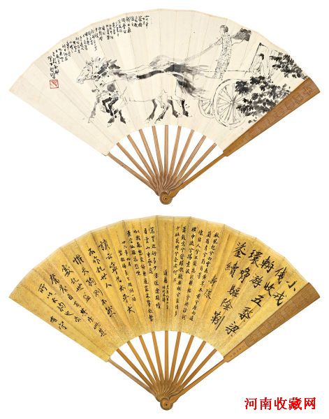 徐悲鸿一面绘《诗经·小戎》诗意,为徐悲鸿画作中极为少见的题材。扇背分别为谢寿康、张道藩、蒋碧微、郭有守所书。谢寿康节录《小戎》原文,呼应画面,张道藩录《秋风辞》,着眼点或在“怀佳人兮不 能忘”、“少壮几时兮奈老何”,颇见依依不舍之情,郭有守借“天狗会”之名加以申说,奋发乐观。惟蒋碧微题词最为凄苦,联想彼时徐、蒋早已分居,盖飘零万里,实非所愿也。